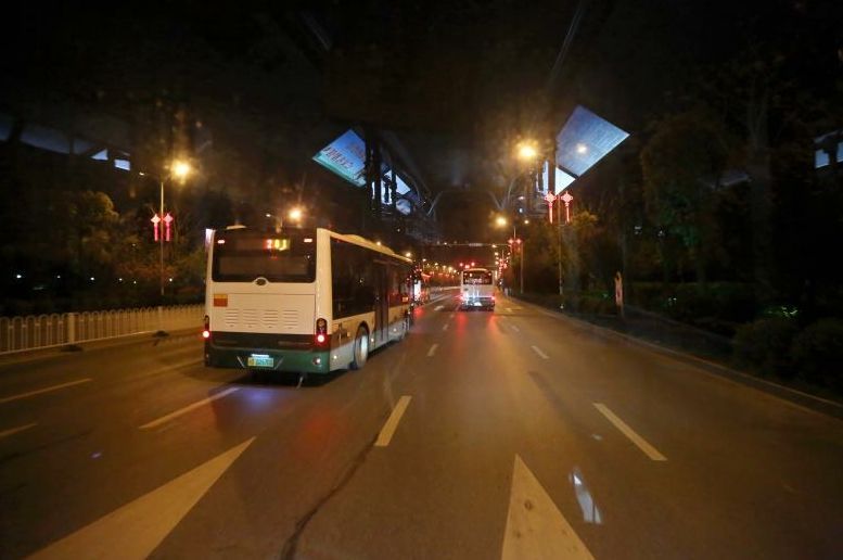 ▲车队有序地行进在宽敞平整的城市大道,奔赴接运赛会志愿者的征途